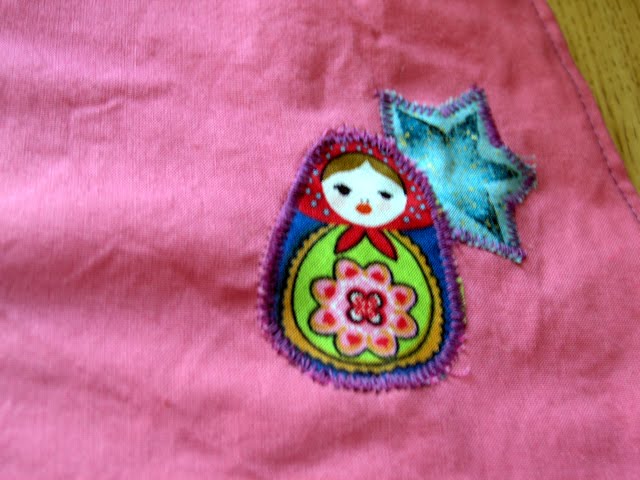 En plus du sac que je vous avais déjà montré, j’ai emmené dans mes bagages 2 tabliers pour mes nièces, réversibles avec des petits appliqués comme j’aime bien, et des rubans pour décorer.