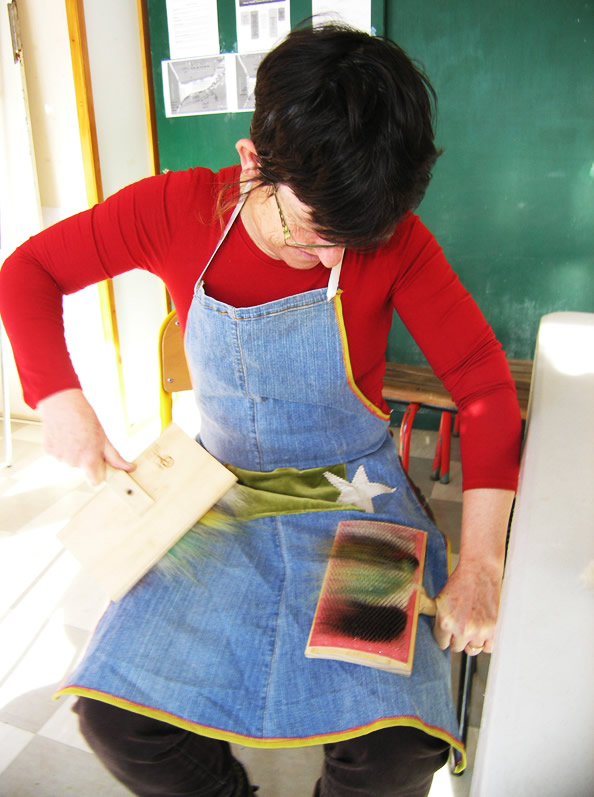 Après une petite pause thé-papillotes, nous avons faite une mini-initiation au cardage, pour à la fois aligner/aérer les fibres, et procéder à des mélanges de fibres et de couleurs.