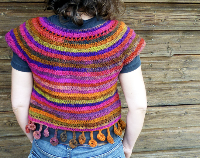 J’ai donc recommencé : chainette, rang ajouré, augmentations, séparer les manches, rajouter quelques rangs… et essayage. YES. C’est beaucoup mieux, sans conteste. Le tombé est plus flou, les dimensions parfaites ce coup ci. Et en plus, les couleurs s’enchainent mieux, c’est le signe que j’avais raison de recommencer !