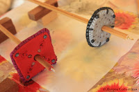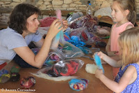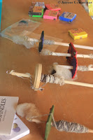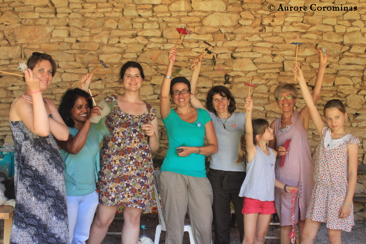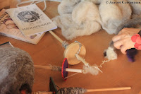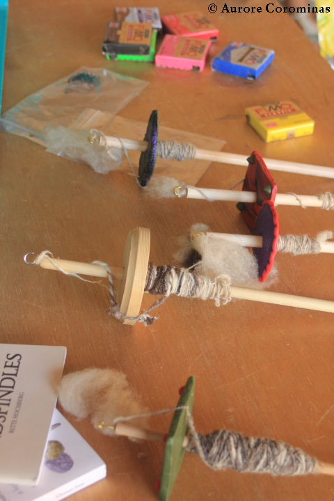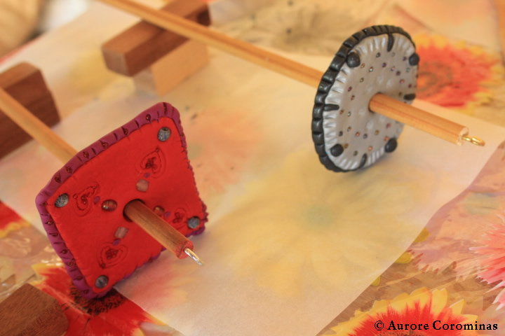Commençons donc par les photos regroupées de 2 ateliers de filage au fuseau, pendant lesquels nous avons à la fois fabriqué nos propres fuseaux en fimo et appris les bases du filage de la laine au fuseau: