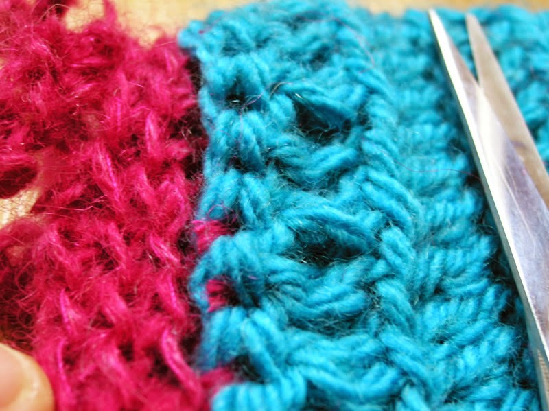 Le but du jeu: viser juste les mailles du premier tour en mohair rose, et Pfft, un coup de ciseau bien placé.