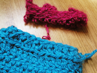 Et déjà on voit les mailles qui se défont. En continuant ainsi tout autour du poignet (attention de ne surtout pas couper les mailles bleues du tour précédent, l’objectif étant de récupérer la laine pour autre chose)