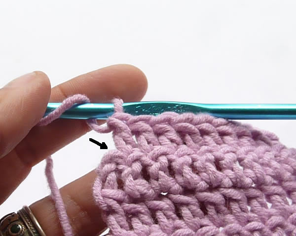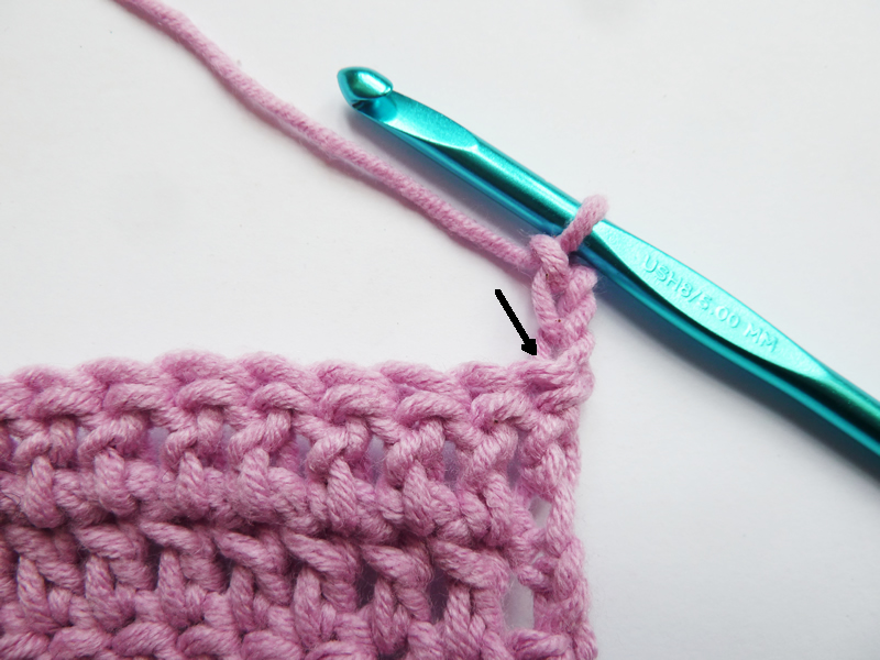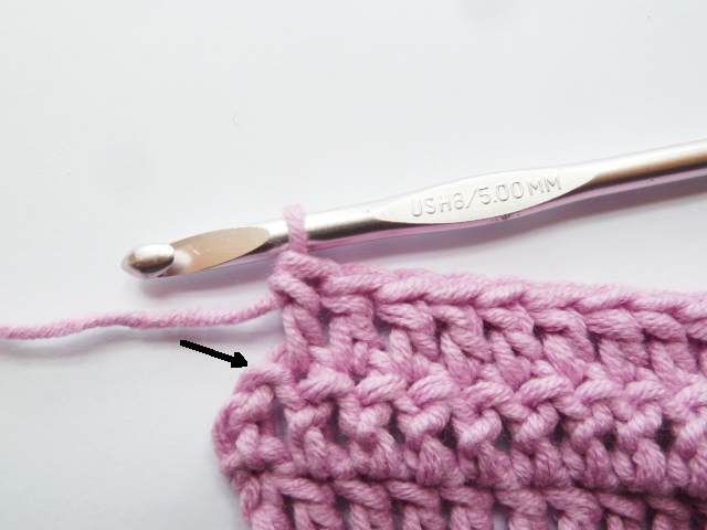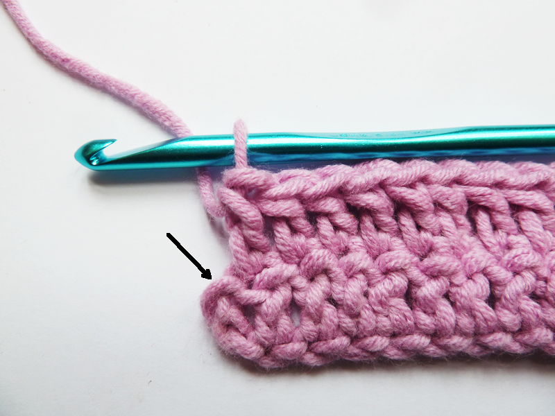En fin de rang, attention de bien crocheter dans les 3 ml du début du rang précédent, indiquées par la flèche, qui comptent comme une maille tout à fait normale.
