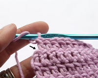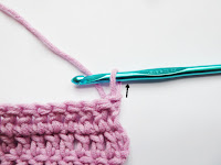 Pour continuer le rang, faites la prochaine maille (une Bride normale) dans la maille suivante, comme indiqué par la flèche. Et en fin de rang, faites la dernière Bride dans le haut de cette Bride de démarrage sans chaînette du rang précédent.