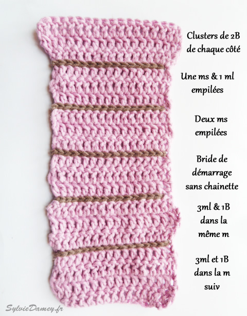 La différence est dans la fin du rang: On y retrouve le “cluster” du début, c’est à dire les (2ml et 1 B) piquées dans la même maille, et qui ne comptent que comme 1 maille. Faites dans cette maille un “mini-cluster” de 2Brides fermées ensemble = 2 brides incomplètes piquées dans la même maille et fermées ensemble.