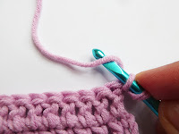 En début de rang, étirez un peu la boucle de démarrage. Puis posez un doigt sur le haut de la boucle afin de la bloquer. Et enroulez cette boucle autour du crochet, en tournant le crochet vers le bas et l’arrière du travail. (un peu difficile à expliquer.. regardez la vidéo ci-dessus !!)